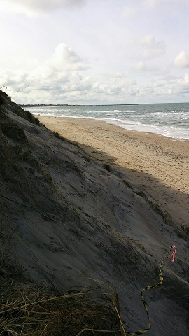 Kommer fram till nästa kontroll vid 26km som ligger nere på stranden, nedanför ett litet fiskesamhälle, mitt bland båtarna. Tar min vanliga dos av energi; energidryck, cola och choklad. Springer längs höga klitter på högersidan, förvånansvärt fast sand, skumbollar på stranden och Nordsjön brusande på vänstersidan. Helt betagande vackert! Efter ett tag tar vi oss upp för dagens brantaste sanddyn. En funktionär står på toppen av dynen och räcker ut en hjälpande hand som jag tacksamt tar emot.